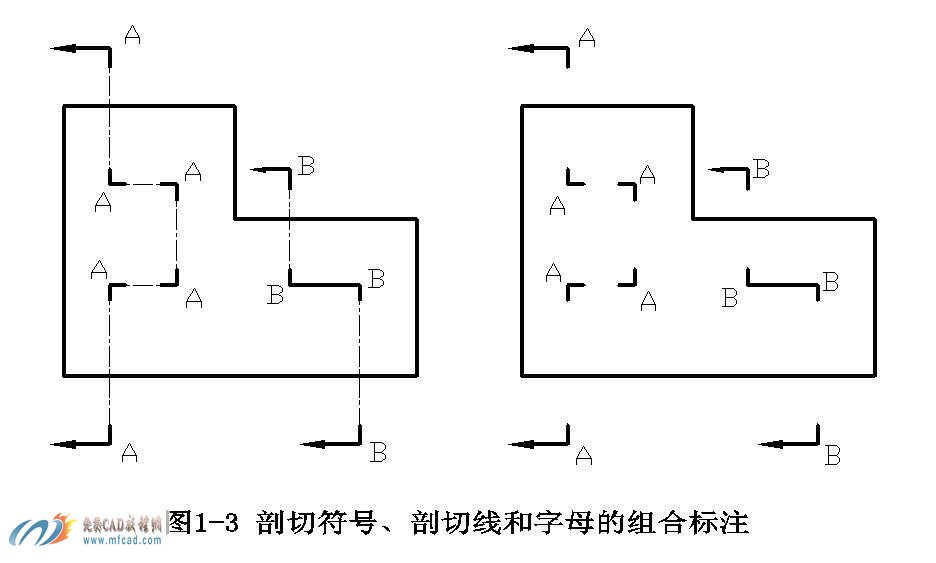 剖切符号、剖切线和字母的组合标注如图1-3所示。
