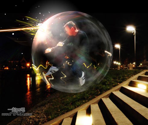 本教程重点介绍类似气泡的球体制作方法。大致过程:先用云彩滤镜做出底纹,然后用液化及一些其它滤镜做出高光,再添加人物及其它素材,并渲染高光等做出透明的气体效果。