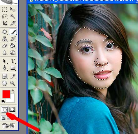 一、快速蒙版:我只用它建立选区,看一个实例:好多磨皮教程里要求把mm的五官留出来,只磨面部皮肤,咱就用下这个快速蒙版。它在哪?这里,按Q也行。