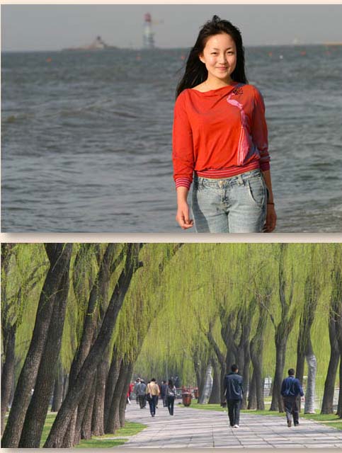 先来认识一下它,先建一个看看:为了看出效果,我们打开一个风景和一个MM,MM在上,风景在下,给MM层添加一个蒙版: |