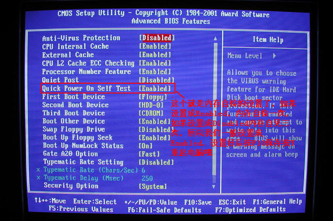 2.关闭BIOS内存自检 这一项有必要讲一下,有的朋友内存是512的。但是开机后那内存检测的数字一直在转啊转的,但是按任意键可以跳过,但是很麻烦。 设置成Disabled内存要自检三次,设置成Enabled自检就为一次,大大加快了开机速度。 详细请看图片6