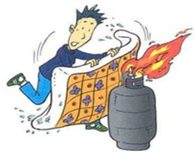 4、燃气罐着火,要用浸湿的被褥、衣物捂盖灭火,并迅速关闭阀门。