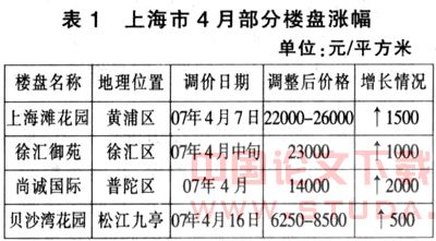 上海2007年上半年的房价呈缓步上升的趋势,据上海易局研究院提供的研究报告显示,4月上海楼市的成交量245万平方米,其中商品住宅成交面积170万平方米,明显呈上升态势。根据焦点网的统计资料,4月全市至少有20多个楼盘出现不同幅度的上涨,其中部分楼盘涨幅如表1所示: