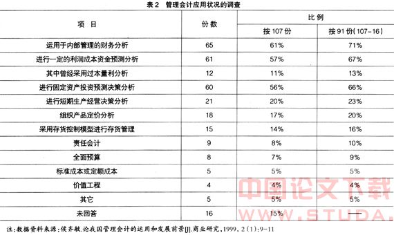 综上所述,目前我国对企业管理会计模式有一定的研究成果,但多局限于理论研究,实践性差,没有针对我国中小企业的特点构建相应的管理会计模式。侯齐敏曾对我国中小企业做过一项是否应用过管理会计和管理会计应用现状的问卷调查,结果如表1和表2所示: