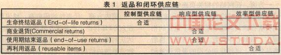 外文文献中,Balram Avittathur和Joseph D. Blackburn在2004年都讨论了返品的时间敏感性,返品的潜在商业价值受处理时间长短影响,不同产品所受的影响程度不同。其中Joseph D. Blackburn按照时间边际价值(marginal values of time,MVT)将产品分为:低MVT产品和高MVT产品,分别和Fisher定义的功能性产品和革新性产品对应。指出要兼顾速度和成本设计逆向物流处理网络,低MVT产品适合采用效率型供应链,相反,高MVT产品适合采用响应型供应链。类似地,认为返品种类要和闭环供应链类型相匹配,不同返品适合不同的供应链类型如表1所示。