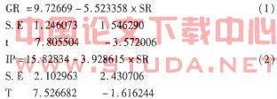 (三)资本市场融资规模与产业结构优化关系的协整检验根据上述单整检验结果,SR、GR和IP这些时间序列虽然自身非平稳,但其某种线形组合却可能平稳。如果存在平稳的线形组合,这个线形组合则反映了变量之间长期稳定的比例关系,即协整关系。以产业结构优化率GR、产业绩效指标IP为被解释变量,资本市场融资率sR为解释变量,建立计量模型:,其中1、为随机扰动项,表示GR、IP中sR无法解释的其他因素,对GR和sR、IP和sR分别进行回归,得到模型(1)和模型(2):