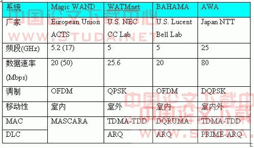 MMAC是由日本推出的多媒体无线接入系统,其目标是通过便携式可视电话和因特网获得信息。如表4所示,目前主要提供两类高速无线接入。第一类用于室内外宽带移动通信系统,用3-60GHz频段传输30Mbps的数据,该项目从2001年开始;第二类提供超高速WLAN室内接入,传输速率达到 600Mbps,采用60GHz频率,即毫米波。但是这些系统不能提供大范围覆盖,也不能用于车辆业务环境,只能用于“热点地区”。研制出的毫米波样机可以演示60GHz的WLAN与ATM或100BASE以太网接口,其数据速率可以达到155Mbps。