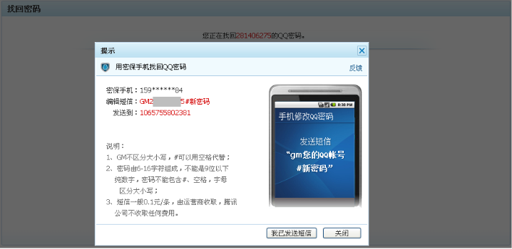 如果您绑定了密保手机,您可以用该手机发送短信“gm您的QQ帐号#新密码”到1065755802381,即可直接设置新密码。